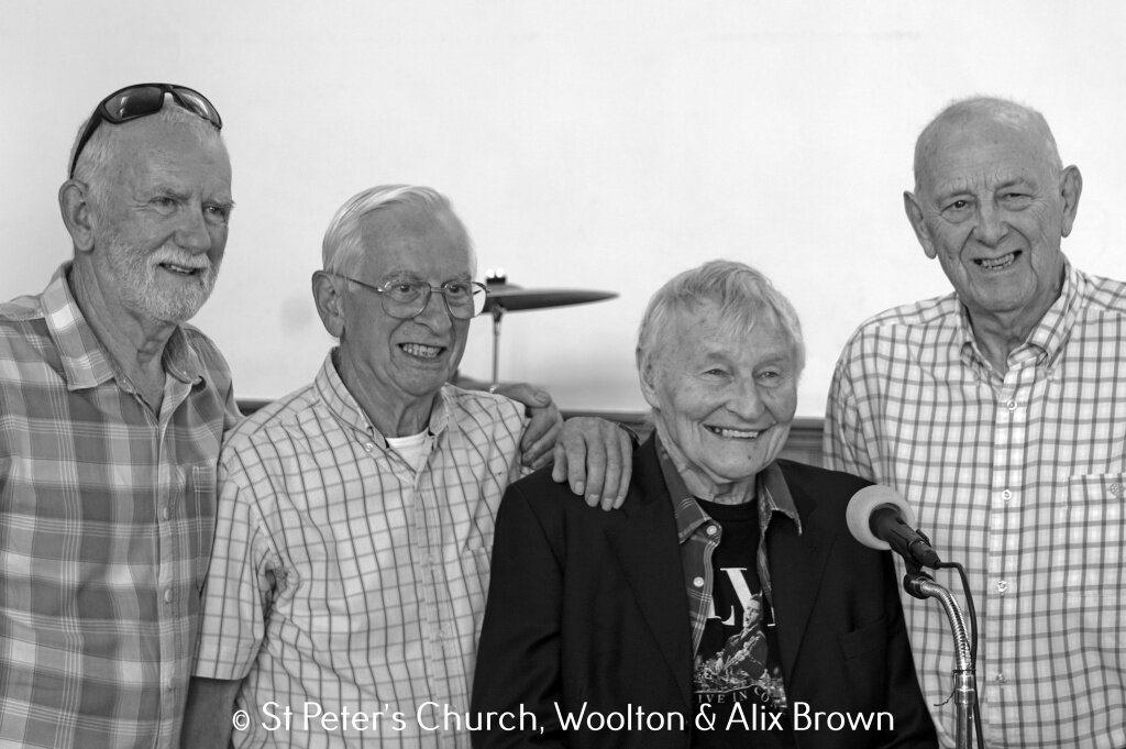The current Quarrymen lineup consists of Colin Hanton on drums – who played with John, Paul and George – Rod Davis now on guitar, banjo player in the Quarrymen on the day John met Paul, plus Henry Duff Lowe on keyboards – the son of John Duff Lowe who played piano on the 1958 recording of “In Spite of all the Danger” and David Bedford, Liverpool Beatles’ author, on bass.